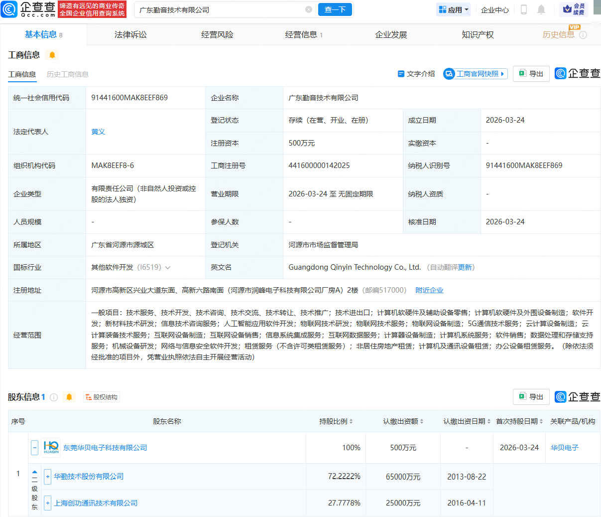 近日,广东勤音技术有限公司成立,法定代表人为黄义,经营范围包含:人工智能应用软件开发;物联网技术研发;5G通信技术服务;云计算设备制造;新材料技术研发等。企查查股权穿透显示,该公司由华勤技术(603296)旗下东莞华贝电子科技有限公司全资持股。